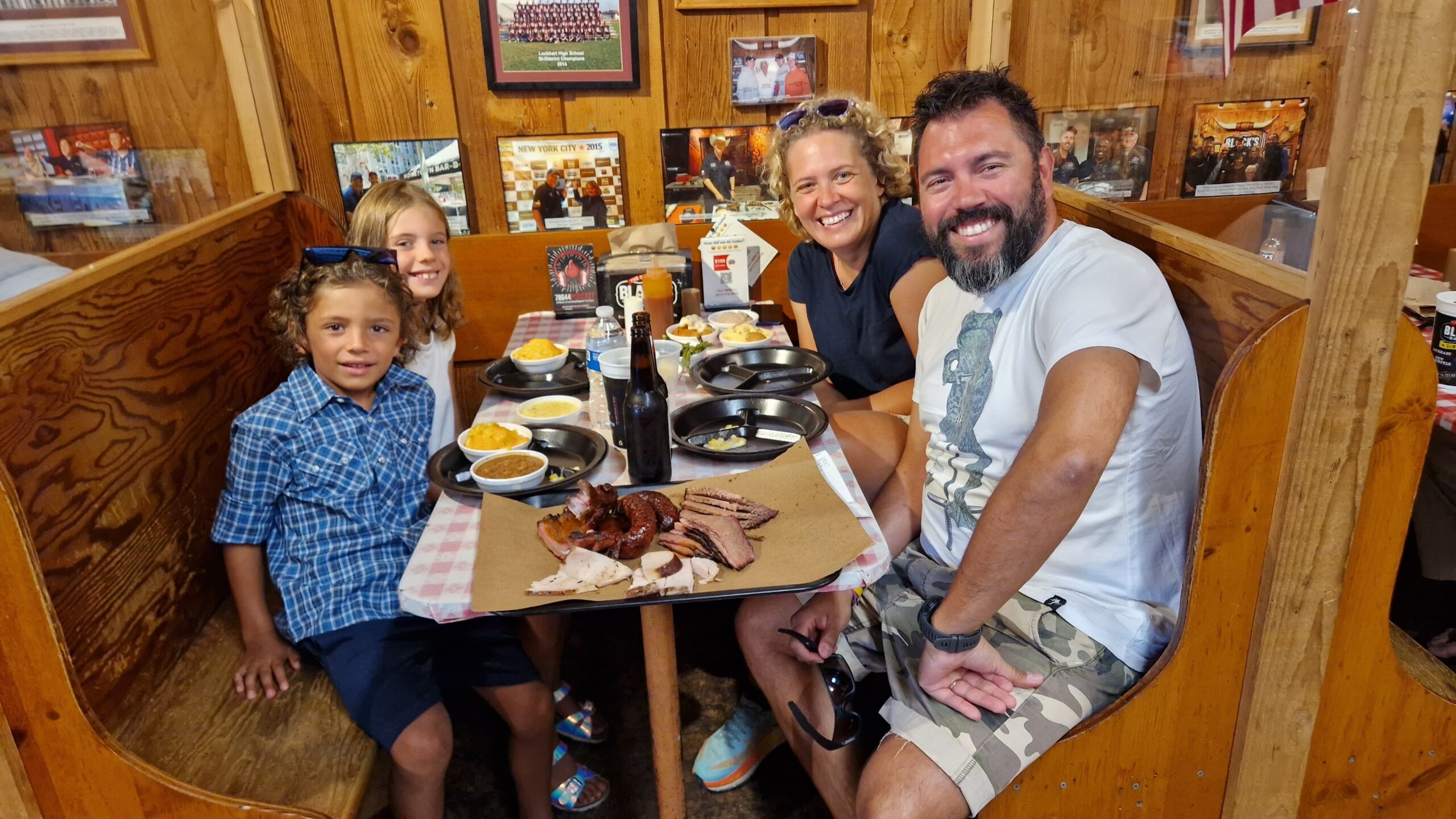 Quando si arriva al bancone della carne, ti accoglie il pitmaster, il capo del barbecue, quello che si occupa del fuoco e della perfetta cottura e affumicatura della carne. Taglia la carne e la pesa su una bilancia prima di fartela pagare. Abbiamo preso il brisket, che è la parte bassa del collo e ha una consistenza simile a quella dei (tanto odiati da me) guancialini, delle ottime costine di maiale, delle salsicce molto più asciutte e speziate di quanto servisse e del tacchino (che ci ha regalato come assaggio ma che era il migliore).